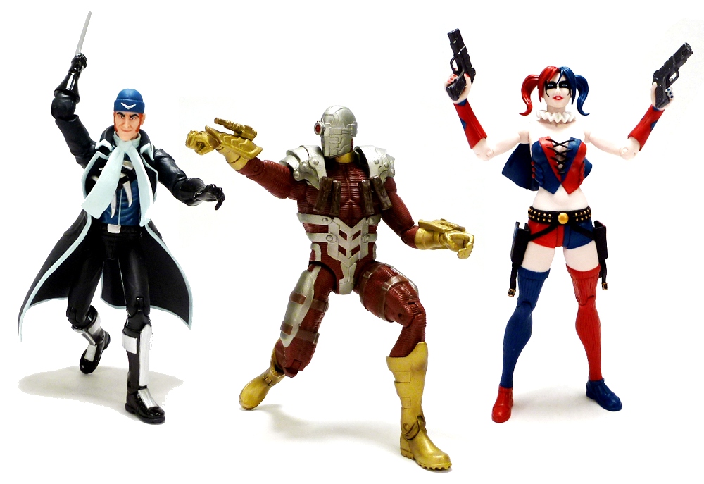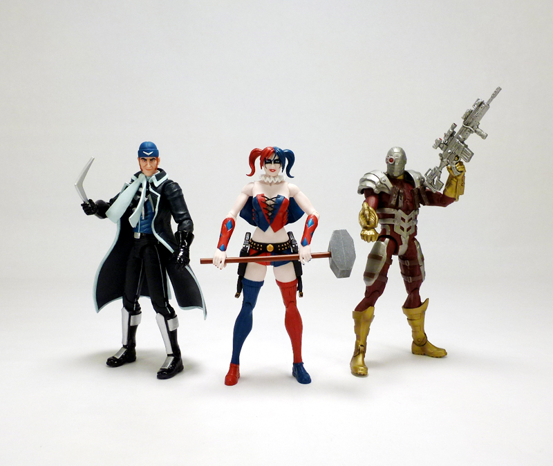 While we may still have to wait for a character as large as King Shark, DC’s trio offers three solid choices with respect both to their importance in comics and their appearance as figures. Harley Quinn is the most famous of course, and she’s never been more popular than right now with her appearances in the Arkham games, her own comic book, etc. The deranged clown appears in the New 52 with a distinctive red and blue outfit with alternating colors and matching hair. Also rising in fame thanks to the character’s appearance in the TV show Arrow is Deadshot, the marksman and assassin with a cybernetic eye and high tech gadgets. A member of the Suicide Squad since its New 52 relaunch, Floyd Lawton wears a full body armor suit with built in weapons, extra ammunition, and a helmet with advanced optics. And then there’s Captain Boomerang, a character that’s existed in DC Comics since 1960, sometimes as a joke and at others a serious threat. The current version of Digger Harkness is an athletic man wearing a long coat, scarf, cap, and a brace of boomerangs on a bandolier. All three Suicide Squad members stand about 6 ¾ inches tall, the default for DC Collectibles figures in this standard scale.