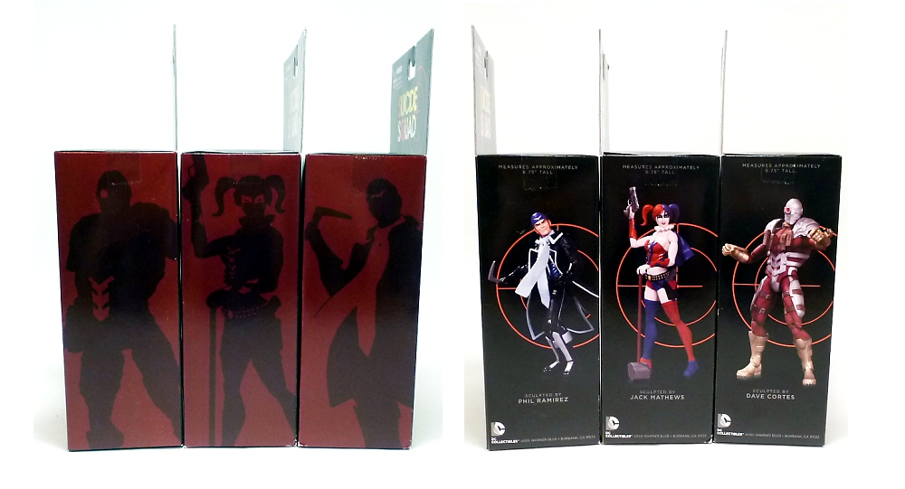 The Suicide Squad figures come in packaging that looks very similar to the other New 52 figures, with a twist. Each is packed in a tall window box with J-hook top where you’ll find the series name and crosshairs logo. The boxes are black like the other Super Villains, immediately differentiated from the white of the heroes. The window to see the figure is provided by the DC “peel” logo, which provides a swath of red on the right side of the front panel with bullet holes and the figure’s name. One side of the package has a black on red silhouette of the character while the other features a photo of the figure along with the name of its sculptor.