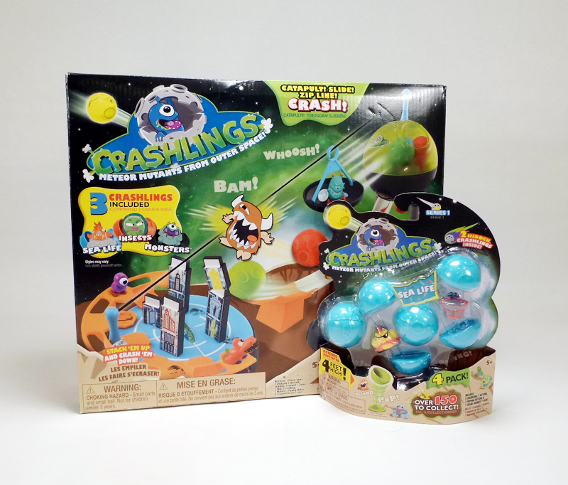 The newest kid on the block comes from Wicked Cool Toys and features unique mini figures with a space theme and lots of play action in Crashlings. Marketed as “Meteor Mutants from Outer Space,” Crashlings are about one inch silly creatures (in themes like Sea Life, Insects, Monsters, etc.) that come in plastic meteors and are perfect for kids aged five and up. Some of these are all hard plastic while others feature a softer, rubbery hemisphere that can be “popped” into the air. With over 150 styles to collect and, Crashlings can be found in single and multiple packs or larger playsets like the Catapult City that adds a ton of play options for kids. Today we’ll be checking out that set along with a 4-pack of Sea Life Crashlings!