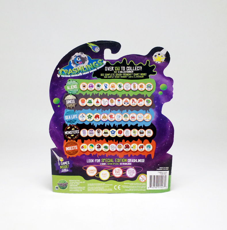 While there are single Crashlings packs ($1.99), the sweet spot for a lot of people will be the 4-Pack ($5.99). Each one has four figures from a single theme with their own meteors, and only two visible in the package means that you’re guaranteed a surprise, and maybe even a rare Crashling, with the hidden pair. The packaging is very cute and kid friendly, with an appealing lumpy surface to the bubble and the card. Graphics prominently point out the size of the first series (over 150 to collect) as well as the theme, in this case Sea Life. The back of the card is dominated by a sample chart of Crashlings across the five themes. Inside the package is a handy sheet with Crashlings games you can play on one side and a 150-member “Crash-Tronomy” checklist on the other.