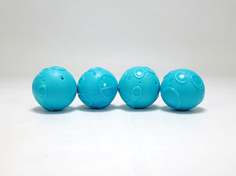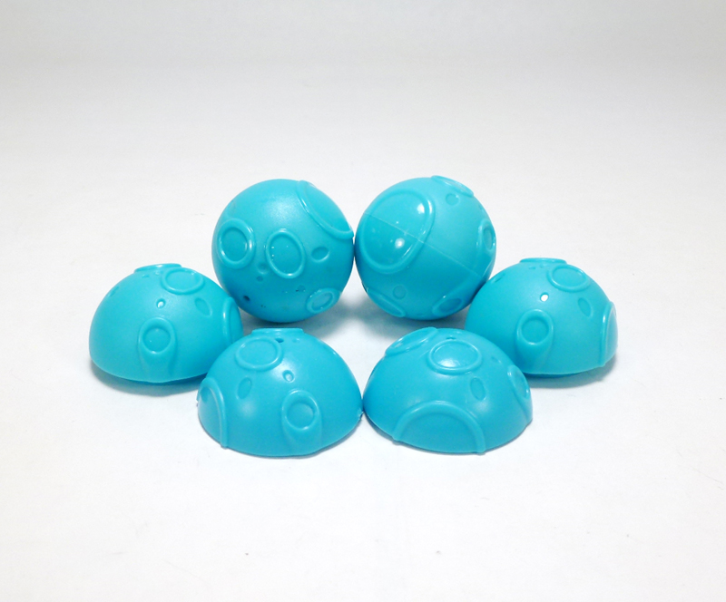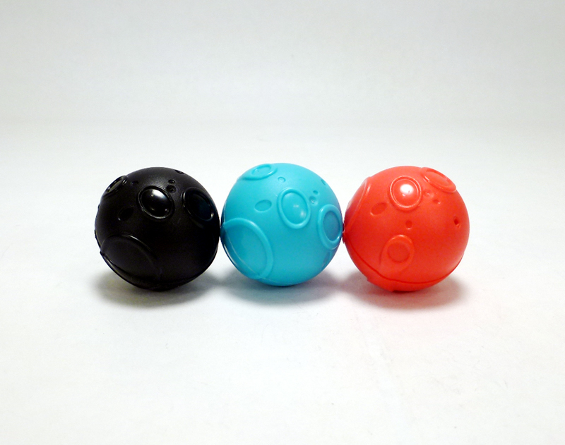 I really like both of the eyeball-related characters, eye patch-wearing Pirate and multiple eyed Battler. Each Crashling comes with/in a plastic “meteor,” a two piece sphere that’s sculpted with an uneven surface of gouges and craters. Some of these meteor halves are rubber and can be “popped” up to four feet in the air. In fact, that popping accounts for a couple of the “game play” examples on the included instruction sheet featuring Meteor Stack, Meteor Catch, Space Jump, Tic-Tac Crash, and Crash and Smash Bowling.