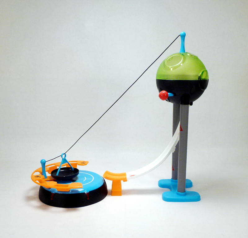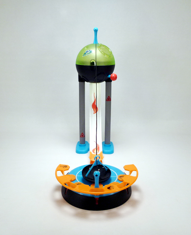 Open the box and like all playsets from the good old days of toys you’ll find a bunch of parts you need to assemble and stickers to apply. The latter is my least favorite part of toys, but even I didn’t have any trouble putting on these. And that’s the only hard part as the playset is extremely easy and straightforward to put together even for the most inexperienced parent. It consists of the tall Meteor Control Tower in which you feed the little spheres to shoot down the High-Speed Launch Ramp and into the Stack & Crash Buildings on the target disc. Separate from the main structure is the actual catapult. The parts are heavy duty plastic that fit together very well and pop apart safely if too much stress is applied.