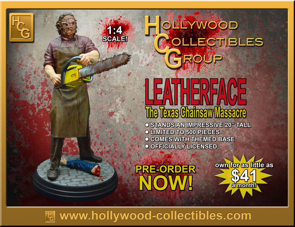 Limited to just 500 pieces worldwide, the 1:4 Leatherface Statue is priced at $329.95, or as little as $41 a month if you use an optional payment plan. The Leatherface Statue is available for pre-order through hollywood-collectibles.com and is slated to ship second quarter 2014.