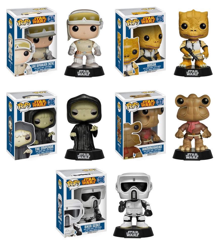 Funko gets in on the Star Wars Day fun by revealing their sixth series of POP! Star Wars vinyl figures. Available this June, POP! Star Wars Series 6 stars Luke Skywalker (Hoth), bounty hunter Bossk, The Emperor, Hammerhead, and an Imperial Biker Scout. Also available, a 6" super-sized terrifyingly adorable Wampa POP!