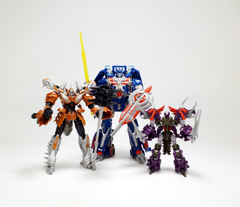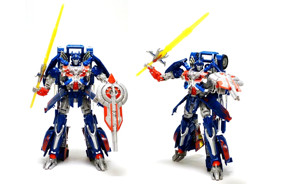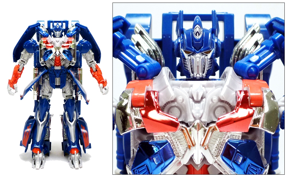 Last but certainly not least is the latest incarnation of the Autobot leader, Optimus Prime. In the largest standard class (Leader), this Prime keeps a lot of the design sensibilities of the previous movie versions adapted to a new sleeker Western Star truck. In robot mode the main figure is very tall and relatively narrow, especially in comparison to other versions. Optimus has long, thin limbs, pointed toes, some truck elements around his feet, and a cool layered, armored torso. On a robot this big there are lots of opportunities for added sculptural detail, and you’ll find it in technological bits and lines all over the arms, upper legs, etc. Flaring off of the hips and shoulders are panels from the truck mode; with articulation of their own they make for interesting poseable armor. Prime’s head is very well done with a complicated sculpt featuring the traditional elements including the shield over the lower part of the face.