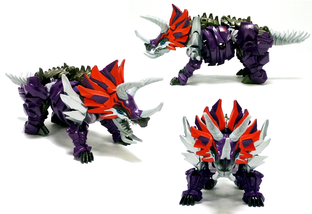As we saw earlier this year at New York Toy Fair, Hasbro is really pushing the Dinobot aspect of Age of Extinction in the toy line with characters both new and familiar to the fans. Here we have Slug, the transforming triceratops you may remember from your youth as “Slag” (Hasbro has since renamed the character since that word has become derogatory slang). Slug retains the triceratops alternate mode and much the same personality according to the brief bio on the back of his card. Translated into the Michael Bay universe of Cybertronians, this dinosaur is low and wide, covered in angular plates resembling both armor and bones. Slug is packaged in his alt mode with a black back, gray tail and foreleg shoulders, purple main body and legs, and a brightly colored head in red and purple with gray accents and bright blue in the eyes; a small red Autobot symbol decorates the creature’s left side. As with most triceratops designs in the past this one doesn’t have an extreme amount of poseability but the legs do move for some posing options, and best of all the mouth opens and closes! The horns and jutting lower jaw are made from a bendable plastic but they stay straight and firm.