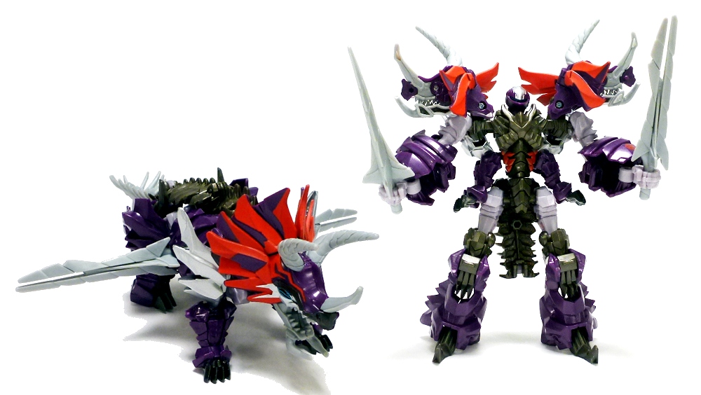 Articulation is good for a Transformer this size and certainly fun for kids, though adult collectors may have some trouble getting it into complicated poses due to limitations from dinosaur kibble. Slug comes with two unique swords that he can wield in robot mode, and you can even plug them into the sides of his triceratops mode. For safety reasons the swords are also made from flexible rubber.
