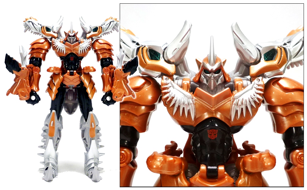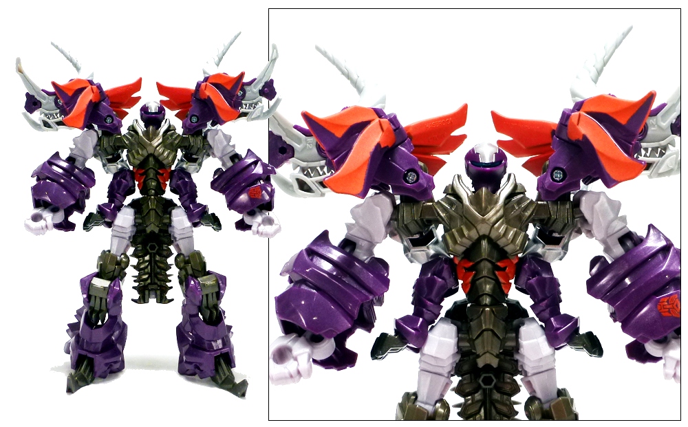 As advertised on the back of his card, Slug’s transformation is completed in only 16 steps. As befitting a Deluxe class Transformer the process is pretty easy to manage, especially since the included instructions show it both ways (alt->robot, robot->alt). While there’s some traditional elements like the hind legs becoming robot legs, there are also some neat twists like the ribcage forming the arms and the triceratops head splitting down the middle to become flared shoulder pieces. Slug in robot mode looks like a tough customer, and thanks to the armor plating and visor-like head is somewhat reminiscent of a knight. His main body and upper limbs are relatively thin with much larger lower legs and forearms, plus of course the added bulk around his shoulders and elements on back like the dinosaur forelegs and tail. The same colors appear as in dino form with the majority in black, gray, and purple; and again the “eyes,” this time a visor slit, are blue and the red Autobot symbol is on Slug’s left forearm.