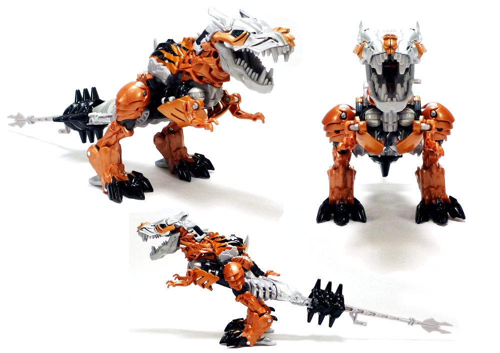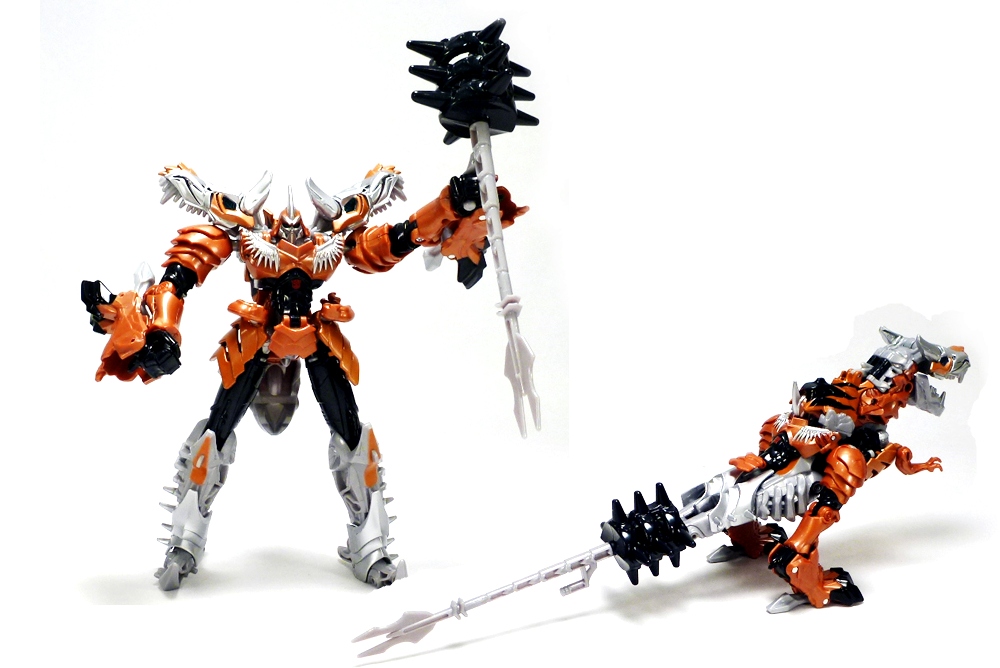 The instruction sheets for both Optimus Prime and Grimlock are alt->robot, the opposite of what you need when you take them out of the package. And it may be that I’m getting old, but I have more and more trouble with the simple “reverse order to convert back.” That being said, Grimlock was not too hard to transform with the advertised 18 steps. Robot arms transform easily into dinobot legs, robot legs become the root of the tail, and the robot’s back and shoulders fold together and forward to become the t-rex’s head and main body. Finally, plus the robot feet into the head of the battle mace to complete the long tail. Grimlock’s t-rex mode really shows off the techno-organic look and feel of the movie dinobots as a robot dinosaur/Cybertronian interpretation. As archaeology has come a long way so have tyrannosaurus rex toys, and this one features the now accepted long version of the animal with tail outstretched behind it. Colors are the same as in robot mode, with some more prevalent black striping on the brown surfaces and black claws on the feet. The main body is long and somewhat bulky with large, powerful legs, tiny arms, and a great blunt head with an open mouth featuring quite a set of teeth! You can pose Grimlock up and down a bit via his hips, his tiny arms are mounted on ball joints, and even the little “ears” are articulated. Best of all, Hasbro included a button next to the head that chomps the jaws shut!