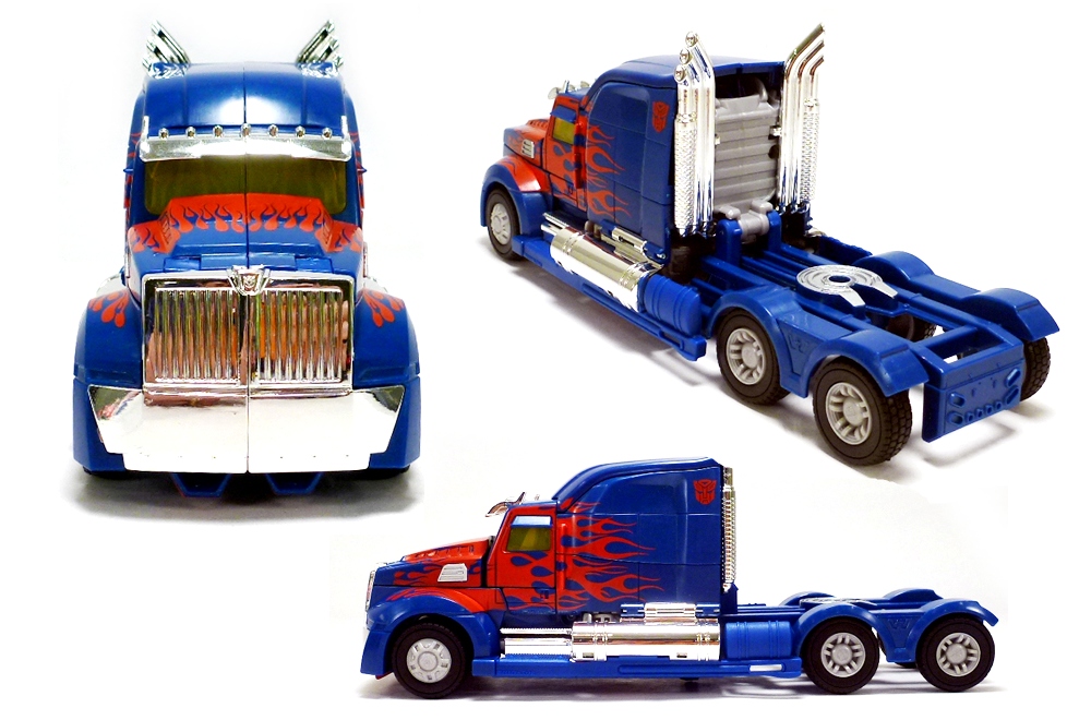 As with Grimlock, Optimus Prime’s transformation instructions are truck to robot, so transforming him for the first time is a little bit of a challenge. Frankly, I gave up halfway through on the hard to decipher images and just kinda figured it out, discovering it was pretty straightforward once you got the thing going. It’s not the usual Optimus transformation scheme either; the legs form the front of the truck while the cab sort of folds up around the robot’s upright torso. Prime’s truck form is pretty rad, a great miniature version of the new Western Star vehicle in blue with red flame accents and lots of chrome. The windshield and windows are translucent yellow, and a small red Autobot symbol stands out on the left side of the cab. Optimus hits the open road with six hard rubber tires, each with an Autobot symbol hubcap; you’ll find more small details like the Autobot symbol on the front grille, “Western Star” printed on the lower steps, and the Western Star logo between the rear sets of tires on each side. As a truck Prime doesn’t have a lot of action features, though the tow assembly can mount the Vector Shield.