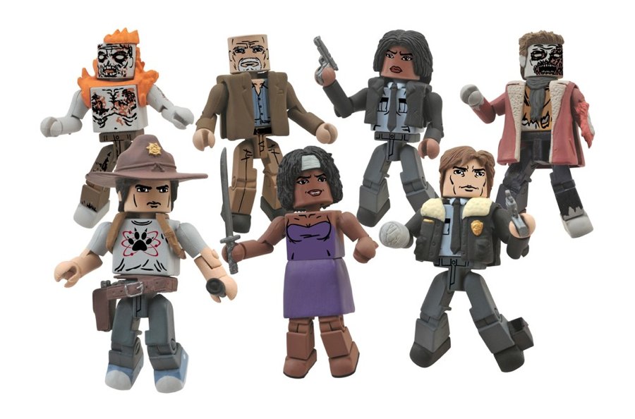 The sixth series of Minimates mini-figures based on the best-selling Walking Dead comic book series brings the cast to the walled compound that would become their home following the fall of the prison. Two-packs include Constable Rick with Douglas, Carl with Burning Zombie, Constable Michonne with Winter Zombie and a rare, one-per-case variant set of Party Dress Michonne with Winter Zombie. Each Minimate mini-figure stands approximately 2 inches tall and features a variety of interchangeable parts and accessories. (Item #SRP: $9.99/ea.)