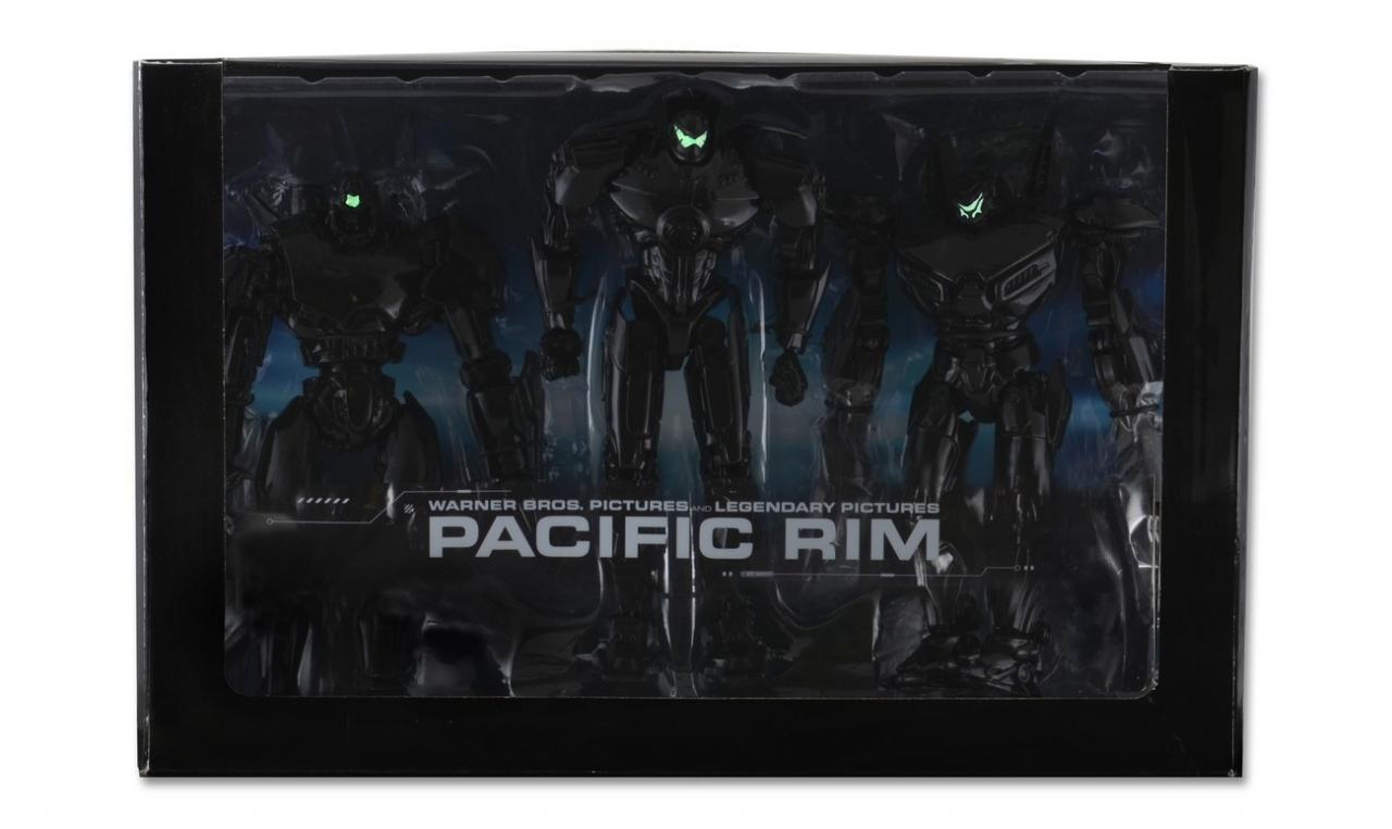 Following their Super Freddy reveal last week (see our story HERE), NECA unveils their second San Diego Comic-Con 2014 exclusive. This time it's pulled from last year's hit sci-fi film Pacific Rim. The "End Titles" Jaeger Action Figure 3-Pack contains black-colored, high-gloss-finish action figures of Gipsy Danger, Crimson Typhoon, and Striker Eureka, packaged and positioned in the same formation seen in the credits. The 7″ Jaegers also have glow-in-the-dark paint effects on their “visors” (or conn-pod windows).