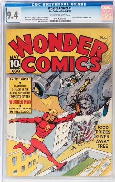 The top comic book offering in the auction came in the form of an exceedingly rare copy of Wonder Comics #1 (Fox, 1939) CGC NM 9.4, the first hero to ride Superman's coat-tails, which realized $68,713 was Wonder Man who made his debut in this very issue, on the stands at the exact same time as Batman's first appearance in Detective Comics #27. Publisher Victor Fox was immediately slapped with a lawsuit by DC (national Periodical) for infringement on their character Superman, causing Fox to withdraw his creation from future issues.