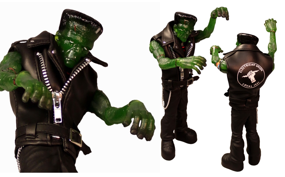 Assembled on the wrong side of the lab, this Frankenstein has attitude! He stands a monstrous 9" tall and features a sleeveless leather vest with his insignia, a real metal wallet chain on his belt, and a tattoo on his bicep. This limited edition monster is cast in a mysteriously translucent green plastic and features ten points of articulation.