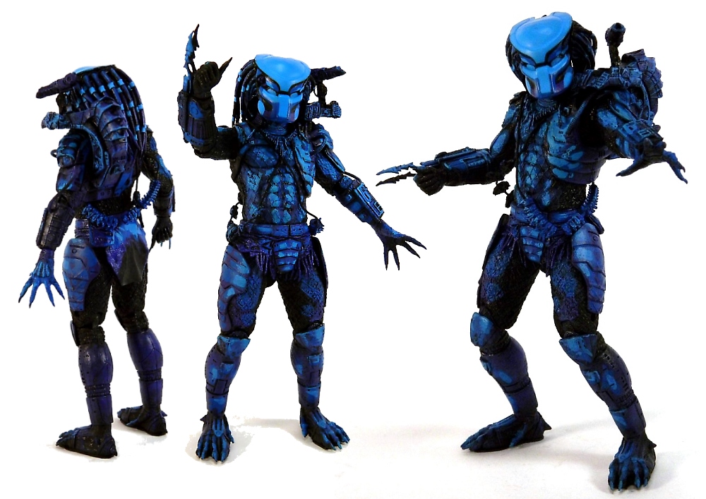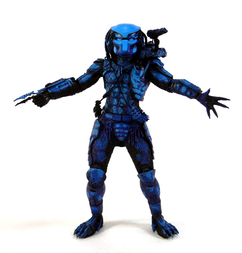 The only difference is the blinding blue color scheme. Why is he blue, some of you youngins may ask? To resemble the 8-bit video game character art! Yeah, game graphics have come a long way, but back in '89 this was cutting edge stuff. NECA brilliantly pulls off the 8-bit look with a cell-shading effect they have so mastered on past figure designs, such as Borderlands. The NES Predator actually has loads of color, including light AND dark blues, some purple and even black. The end result is very cool - both as a retro 8-bit design and as a passable Predator concept. Aqua Predator? Some sort of active camo? Smurf slaying Yautja? Imagine what you will, but it looks wonderful. For some serious psychedelic fun, pose the NES Predator with Series 11's Thermal Vision Dutch. Alas, my NES Predator is being displayed in that incredible retro box.