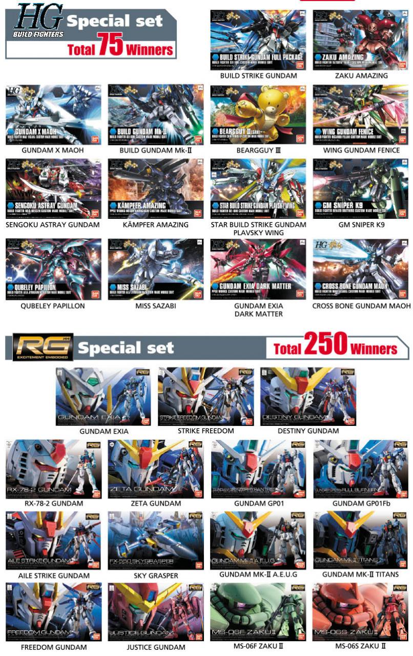 Winners will be selected by an instant lottery system from all valid entries will be notified immediately if he/she has won a prize. Winners list will be made public on "gundam.info" a week after campaign ends.