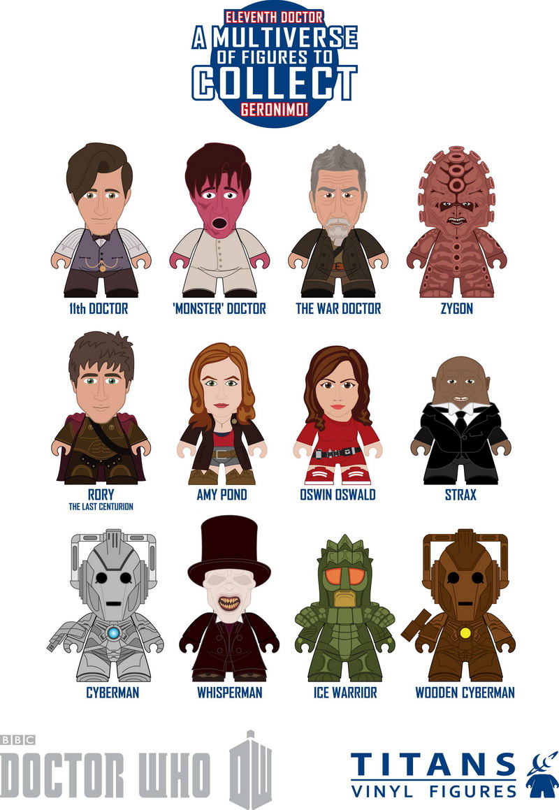 Featuring The Eleventh Doctor and his long-requested companions (plus a bunch of unforgettable enemies) the Geronimo Collection is debuting at San Diego Comic Con 2014! Each figure is 3" blind-boxed and certain figures come with a character-specific accessory.