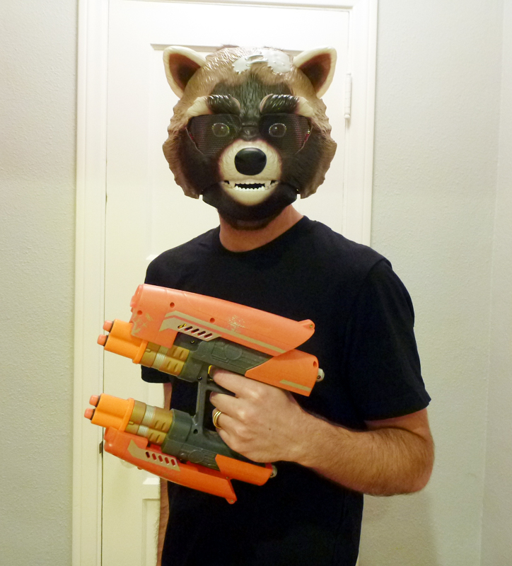 Speaking of fun, what’s more enjoyable than dressing than dressing up like your favorite characters and using their iconic accessories? Nothing, that’s what. The Guardians of the Galaxy toy line has several role play toys headlined by the Rocket Raccoon Action Mask and Star-Lord Quad Blaster ($19.99). Dressing up as Rocket has never been easier with the mask, and it gets its “Action” descriptor thanks to an innovative trigger mechanism in the mouth; a kid can hit the pad with her chin to activate the opening mouth and moving eyebrows and ears! I do say kid, because while I was able to squeeze the mask onto my big head I wasn’t left with enough room to activate the mechanism. However, the Quad Blaster (comic book fans will call it the Element Gun) is one size fits most and good for kids of all ages. The hefty role play gun has two triggers that pop open the top and bottom sections to reveal the barrels and then shoot four NERF darts! The usual warnings apply (don’t aim for eyes or pets), though I’d caution against shooting a pregnant wife as well. Little Peter Quill fans can also check out the Star-Lord Role Play Set with mask and blaster.
