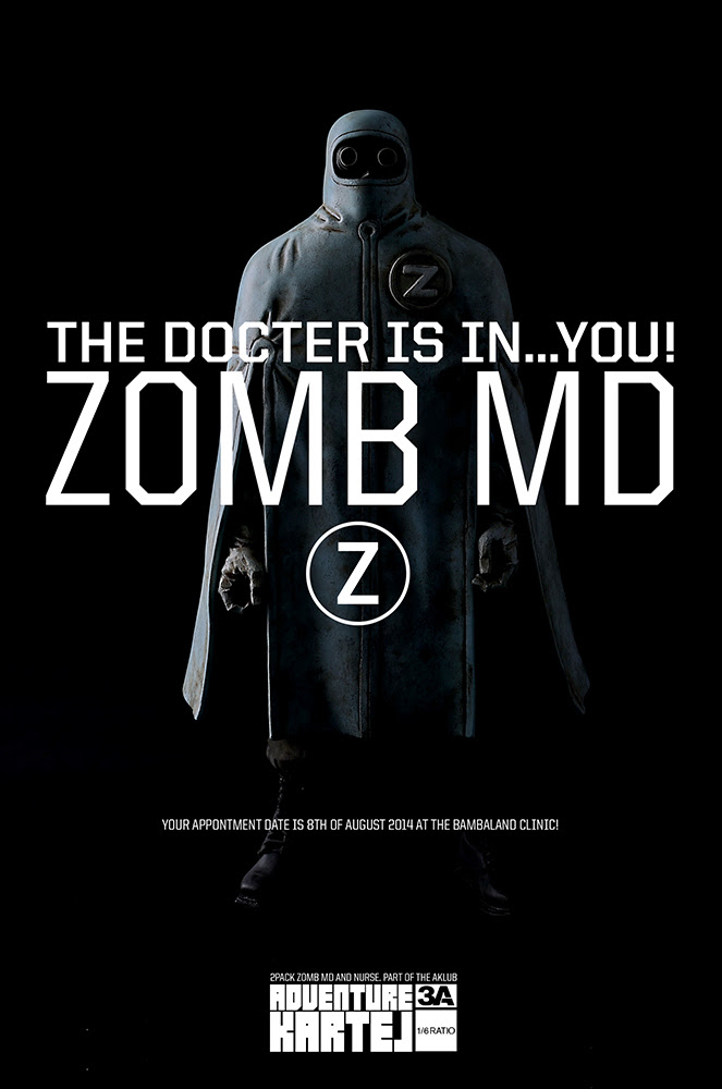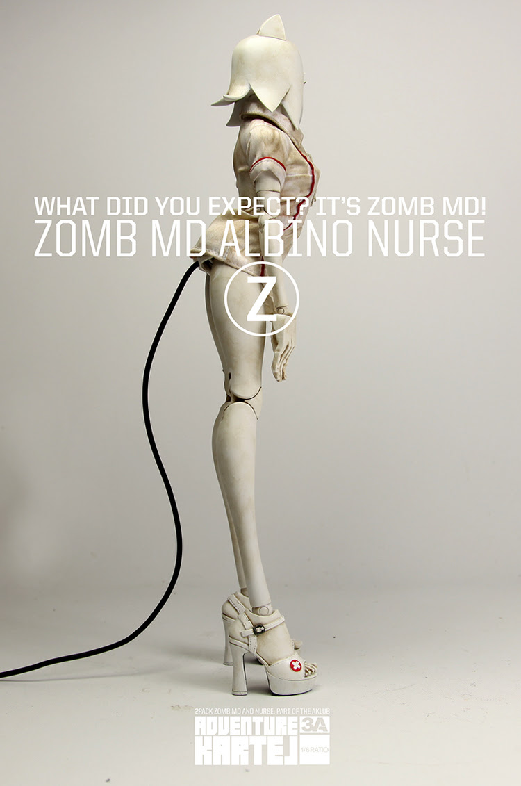 Ashley Wood's latest 1:6th scale 3A figure offering is now available for order (bambalandstore.com). ADVENTURE KARTEL - ZOMB MD, shipping 4th quarter 2014, is available as a single figure ($140) and also in a 2-pack ($260) that includes an ALBINO NURSE. Prices include free international shipping.