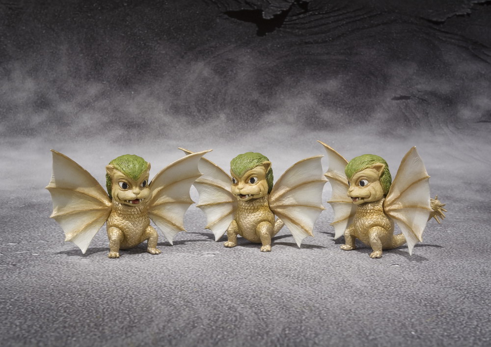 Mecha King Ghidora joins S.H.MonsterArts standing tall at an impressive 9.8 inches (25cm). Precisely placed ball joints in the neck and tail allow for unrestricted posing possibilities. The machine hand on Ghidorah’s mechanical torso armor is interchangeable and perfect for posing with your favorite classic S.H.MonsterArts Godzilla. Use of die-cast material adds to the authentic look. In addition to the machine hands, set includes three adorable Dorats and special display stand and support parts.