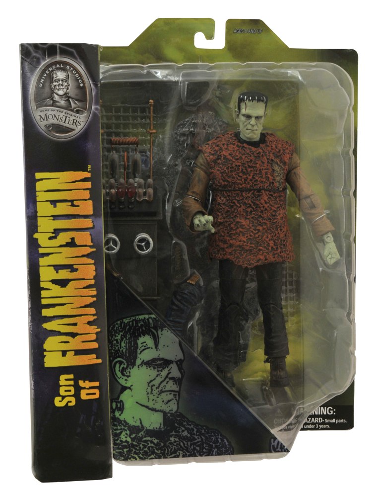 A Diamond Select Toys Release! The monster returns! Diamond Select Toys revisits Frankenstein's Monster with this all-new figure depicting the monster in his outfit from 1939's Son of Frankenstein. This 7-inch-scale action figure features an all-new sculpt with all-new articulation, and can strike multiple poses on his deluxe display base, featuring equipment from Dr. Frankenstein's lab. The Monster and his base come packaged in Select-style display packaging, with spine artwork. Sculpted by Jean St. Jean. (Item #APR141979, SRP: $24.99)