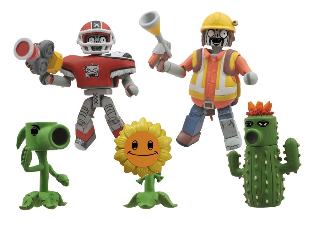 A Diamond Select Toys Release! The brand-new PvZ console game is now the craziest set of Minimates mini-figures ever! Two zombies and four plants from Plants vs. Zombies: Garden Warfare come together in this battle-ready six-pack, as the Cactus, Sunflower and two Pea Shooters take on the All-Star Zombie and Engineer Zombie. Each Zombie Minimate mini-figure is 2 inches tall with 14 points of articulation and features a variety of interchangeable parts and accessories. A Diamond Select Toys release. (Item #MAR141938, SRP: $19.99)