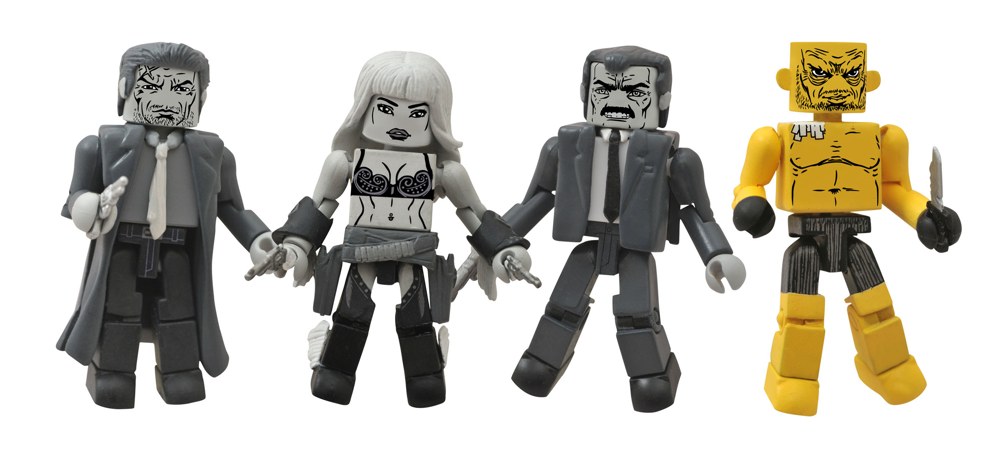 A Diamond Select Toys Release! The most dangerous city on Earth is now a far less dangerous line of Minimates mini-figures! The first assortment of black-and-white Minimates based on Robert Rodriguez and Frank Miller's hit movie Sin City includes four different mini-figures from "That Yellow Bastard": Hartigan, Nancy, Senator Roark and the Yellow Bastard himself. Each 2-inch mini-figure features a variety of interchangeable parts and accessories. (Item #MAR141948, SRP: $19.99)