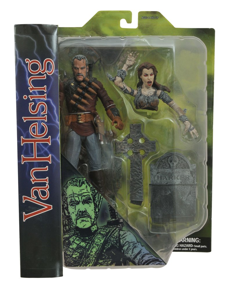 A Diamond Select Toys Release! Monsters beware! Diamond Select Toys is unleashing a fearsome foe upon every monster action figure in your collection, and it's none other than famous monster-hunter Van Helsing! Based on an original design, this 7-inch action figure comes armed to the teeth with stakes, axes and a crossbow, making him more than a match for any and all supernatural creatures. Van Helsing includes a deluxe cemetery base, featuring a female vampire rising from the grave, and comes packaged in Select-style display packaging, with spine artwork. Sculpted by Jean St. Jean. (Item #APR141978, SRP: $24.99)