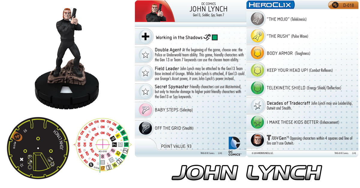 Finally, there’s the new figure John Lynch. A Gen13 veteran from Wildstorm, Lynch is a cool secret agent figure holding a pistol at the ready with some really neat details like the scars across his face. His 93 points gives you a really good team player who can do some damage with a trait giving his allies the Police or Underworld team ability and a special Mastermind, Telekinesis, Leadership, Outwit, Enhancement, and more. Plus, you can swap out Grunge and place Lynch on your Gen13 team base, and his asset prevents nearby opponents from using Outwit! Notably, the Spymaster also brings a new keyword into the game with “Team 7,” and hopefully we’ll see more of that unique lineup soon.