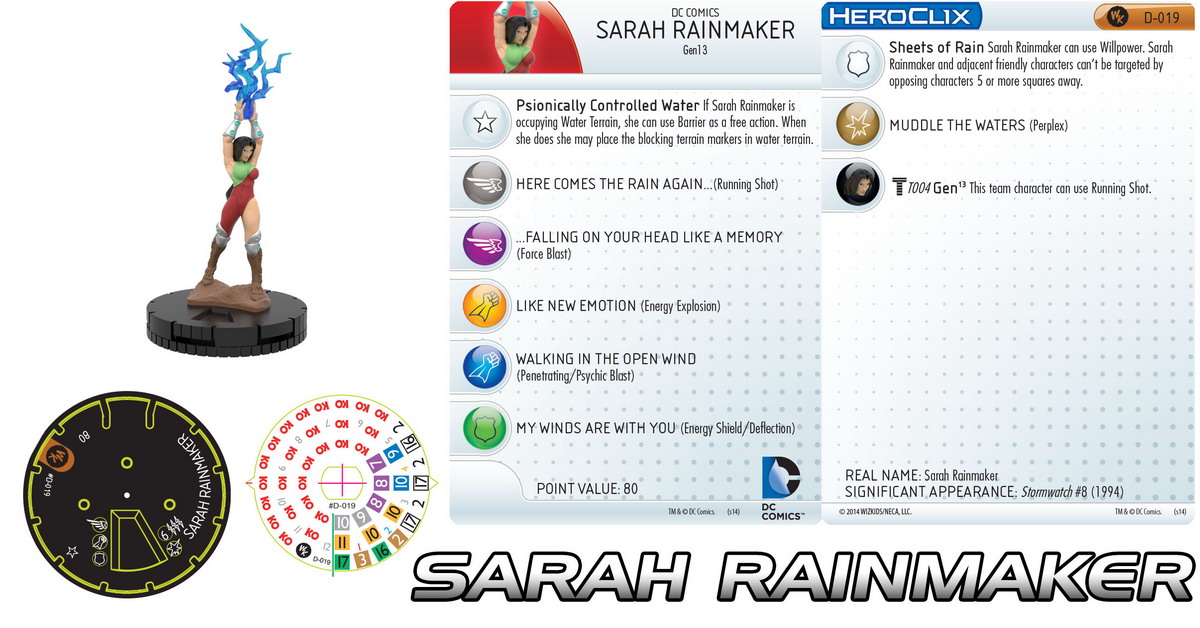 In the Gen13 set, Sarah Rainmaker came in at 80 points, the exact same cost as her previous version. WizKids made several very interesting changes to this incarnation, though, which give her a unique feel and a new place on the battlefield. Starting Running Shot and Energy Explosion plus Perplex, Penetrating/Psychic Blast, Willpower, and more make her highly offensive, and the additional target (three!) increases her potential effectiveness that much more. For Cheshire, WizKids gave us a slightly beefier version in the OP kit, 8 points more expensive. While the main set figure really focused on Stealth and Poison, her bigger sister brings those in a trait and tacks on a ton more with Charge, ignoring a bunch of things for movement, and a full dial of powers (both standard and special).