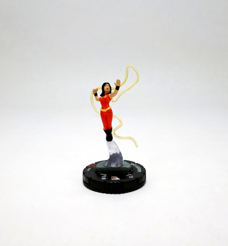 So how about an exclusive reveal? Check out the new Wonder Girl! Donna Troy returns with the same sculpt from the New Teen Titans team base booster featuring the powerful hero in her red jumpsuit flying through the air with her translucent lasso whipping around her as she prepares to ensnare an opponent. At 110 points, this new version is slightly less expensive than her 135 point predecessor, though she’s still very versatile and highly useful. Right off the bat we see that she has the Teen Titans team ability, Flight, Indomitable, and a 4 range. Her starting click actually has the same stats as the previous figure, and comes packed with the stellar combination of Hypersonic Speed and Impervious! After that she switches to a more sustainable power set with one special power granting Charge and Flurry, a second letting her Mind Control hit opponents with two action tokens, and Invulnerability. Late dial Wonder Girl drops to Toughness and gets Sidestep, Quake, and Support. The monthly OP kit figure has the same Amazon and Teen Titans keywords, and instead of giving the team base Super Strength and Flight offers Support and Flight through her asset.
