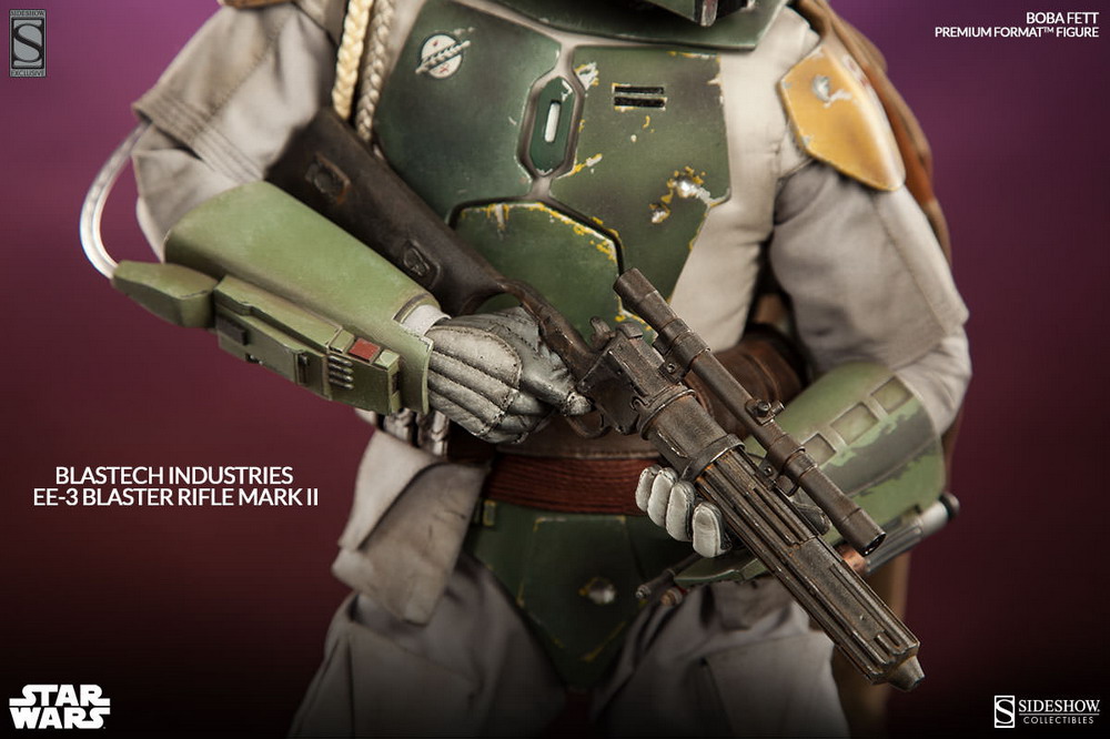 Arm Boba Fett with his BlasTech Industries EE-3 Blaster Rifle Mark II swap-out accessory, available only with the Sideshow Exclusive Edition (shown below).