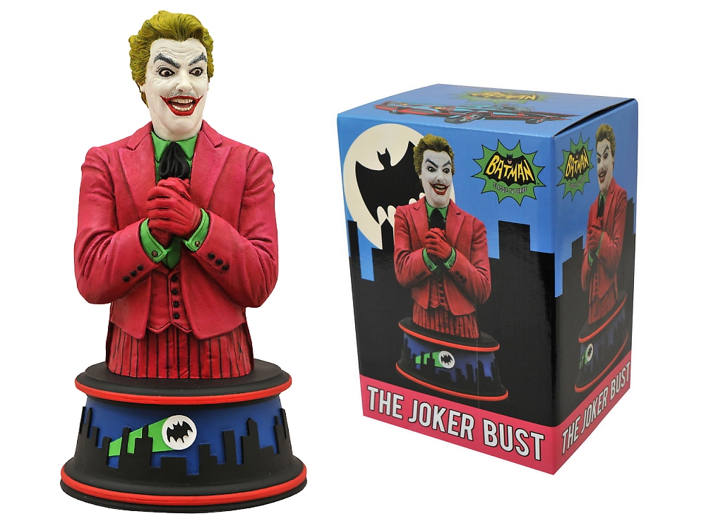 DST continues their line of busts based on the Batman Classic TV Show, and this one is no joke! Hot on the heels of Batman, it's The Joker, as played by Cesar Romero, with his painted-over mustache and all! This bust measures approximately 6 inches tall, and is a must-have for any Classic Batman TV Show fan. Designed by Barry Bradfield! Sculpted by Jean St. Jean. (Item #MAR141944, SRP: $59.99)