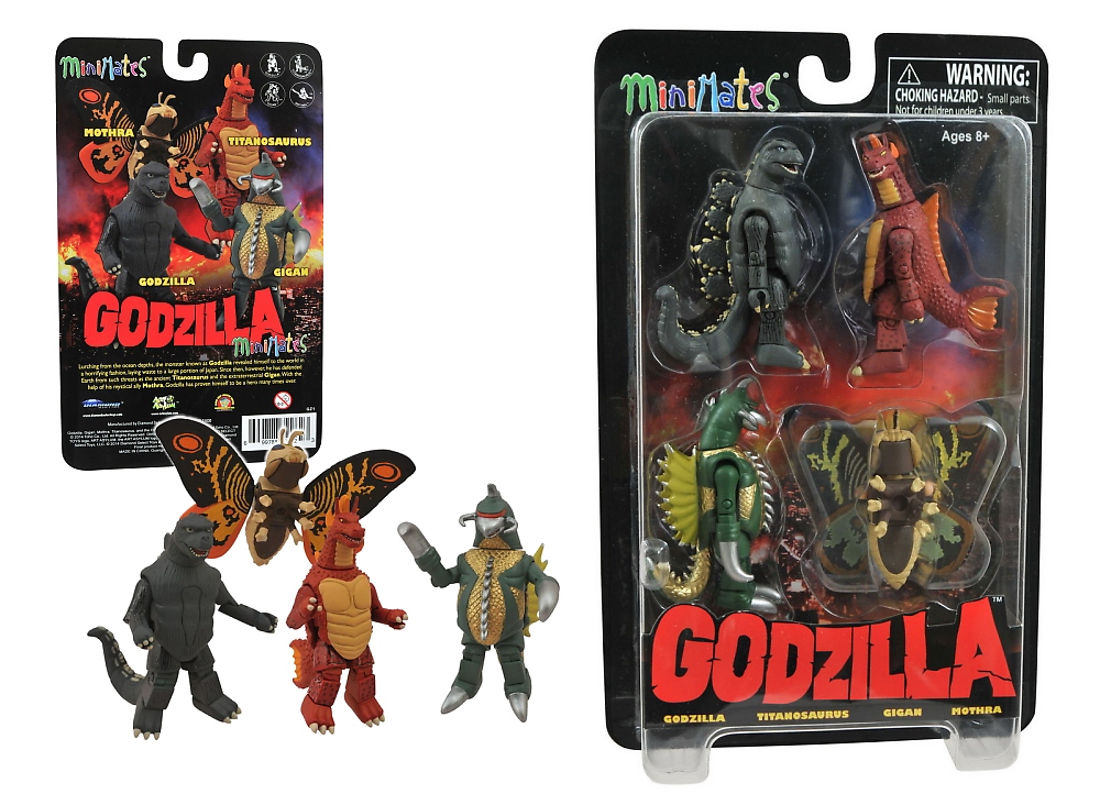 What's the best way to stop a towering atomic monster? Put him in your pocket! Celebrating 60 years of Godzilla movies, this box set of classically-styled Minimates includes Godzilla and three of his most famous friends and foes: Mothra, Gigan and Titanosaurus! Each Minimate mini-figure stands approximately 2 inches tall and features a variety of interchangeable parts. Packaged on a blister card. (Item #MAY142232, SRP: $19.99)