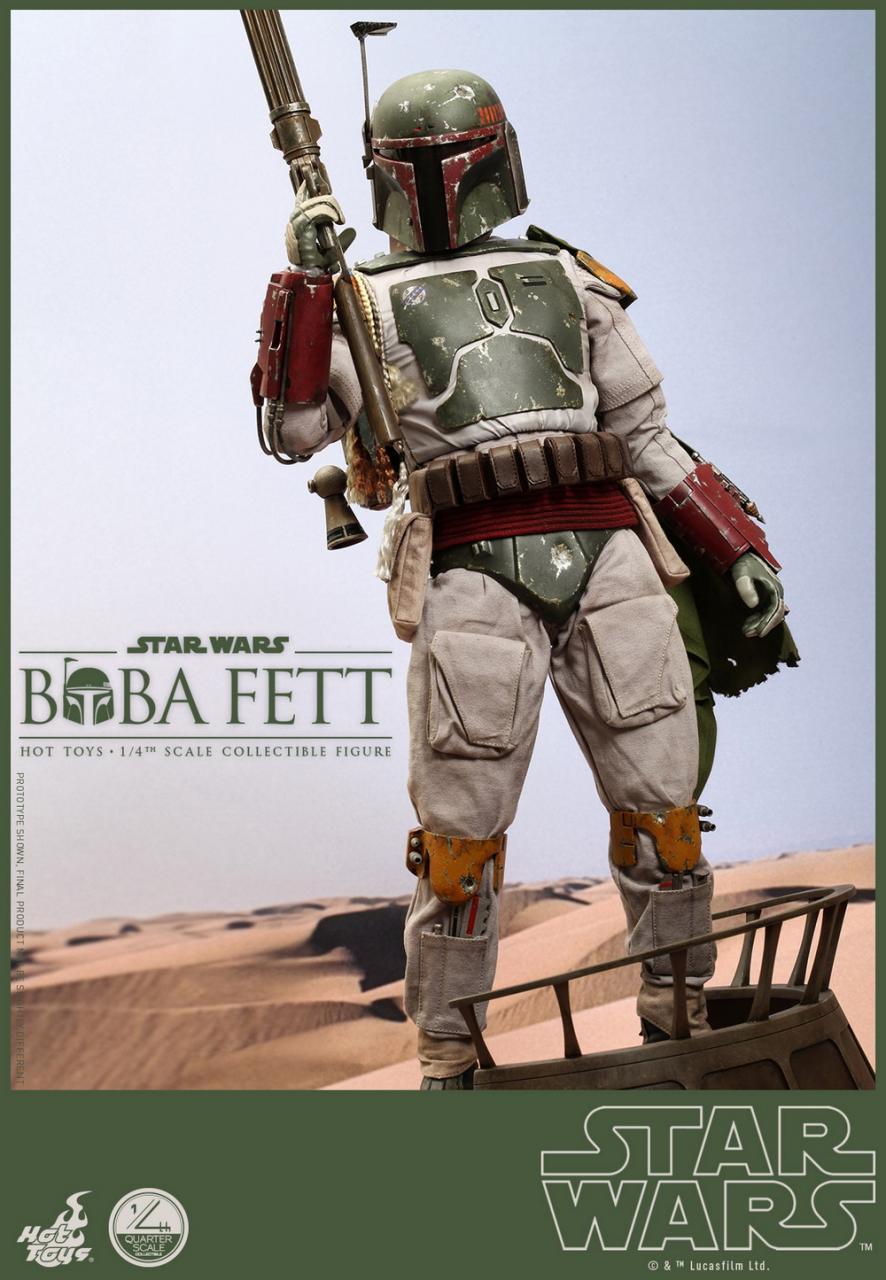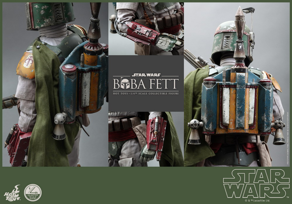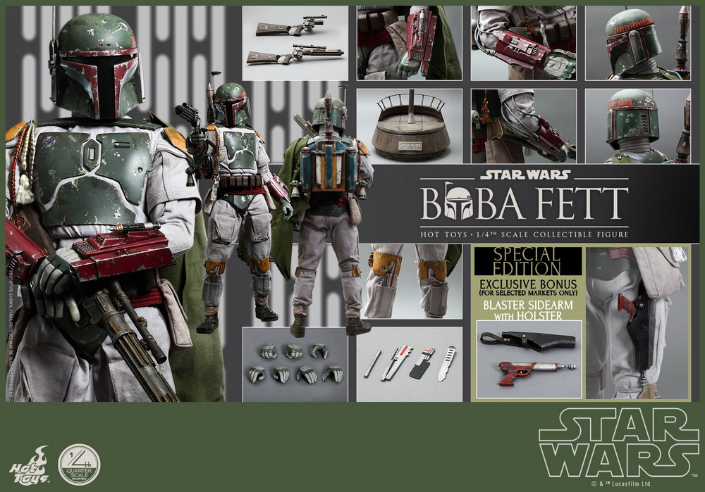 The highly-accurate quarter-scale collectible figure is specially crafted based on the image of Boba Fett as seen in Star Wars Episode VI: Return of the Jedi featuring finely sculpted helmet and armor, his signature jetpack, highly detailed weapons, accessories, and a specially designed sail barge figure stand all with skillfully-applied distressed effects. A special edition will be available for selected markets and include a blaster sidearm with holster which Boba Fett has in Star Wars: Episode V Empire Strikes Back.