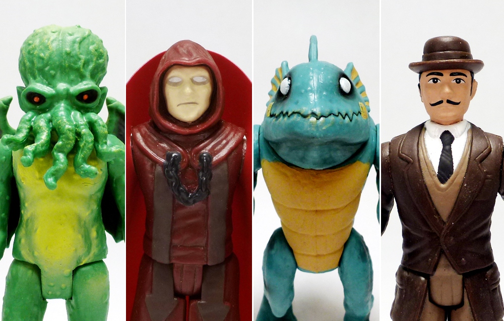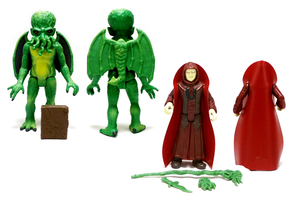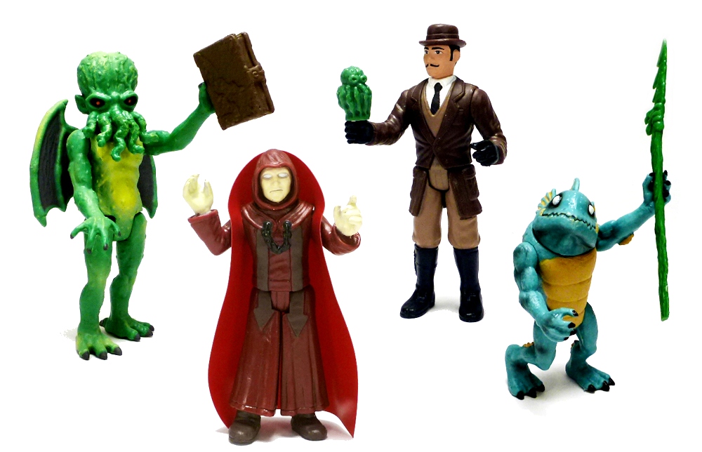 As we learned from Warpo, selecting the characters to include in this toy line was a complicated and tough process. They wanted to make some cool monsters and the cultist but to be authentic to tradition it needed to have a hero and balance between the “real” and alien. To that end they settled on the academic but intrepid Professor, a deranged Cultist, his Deep One lackey, and a mighty Spawn of Cthulhu! Lovecraft’s tales never really celebrated the action hero type, but had several iconic brainy protagonists like Dr. Armitage in the Dunwich Horror; the Professor works great as a character like that or the more straightforward no nonsense Inspector Legrasse of Call of Cthulhu. Cultists abound in the supernatural tales, driven mad by the Great Old Ones and worshipping with insane devotion. The Deep One comes specifically from the Shadow over Innsmouth in which a town is taken over by these fish-like humanoids from the deep, and the Spawn are essentially miniature versions of their dark god Cthulhu. All in all it’s a fantastic set of characters whether you’re looking for something to spice up your retro 3 ¾ inch collection or you’re a diehard Lovecraft fan (like me!).