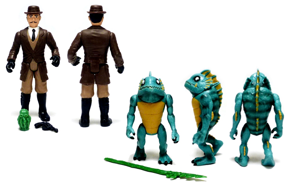 Paint work is always crucially important on toys, and thankfully that’s another area in which these figures excel. In fact, it seems as though they could have gone much further but purposefully pulled back to stay within the strictures and traditions of their target era. Each character has a totally unique color scheme and appropriate details whether they’re on clothing or weird flesh. The Cultist is resplendent in a dark red robes bordering on purple with added touches of brown and black; meanwhile, his flesh is pasty and his sunken in eyes a creepy solid white. On the other hand, the Professor is all business in his white dress shirt, dark tie, tan sweater and pants, dark brown hat and jacket, and black boots and gloves. He has a much better tan than his cult companion and he has sharp black hair, eyes, eyebrows, and moustache. The Spawn looks like most representations of Cthulhu you may be familiar with, specifically in an eldritch green that lightens to a yellowish on the top of the head, belly, and along the limbs. There’s nice shadowing in the wings and gray on its claws, and the creature’s eyes are beady red orbs within black holes. Last but not least is the Deep One, colored in a groovy aquatic pale blue that’s broken up by nicely applied darker bands of coloration, black claws, and tan on the underbelly and fins. The tusk-like teeth sticking out of its mouth are the same tan, and its bug eyes are white spheres in sunken black sockets.