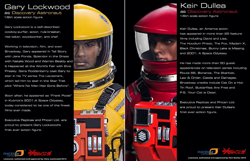 Executive Replicas and Phicen Ltd. present Gary Lockwood and Keir Dullea as their first ever action figures. Created in one sixth scale, these figures depict the two actors as they appeared in 2001: A Space Odyssey decked out in their Discovery astronaut gear. Pre-orders open soon at goheroshop.com with shipping expected in the third quarter of 2015. Pricing has not yet been announced.