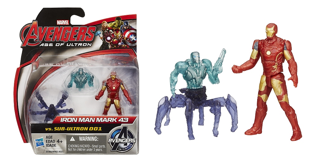Join the battle with the Super Heroes of Marvel’s Avengers: Age of Ultron and stop Ultron! Each figure 2-pack features a 5 point articulated 2.5-inch, movie-accurate Avengers Super Hero facing off with a two piece sub-Ultron figure. Kids can collect the sub-Ultron figures to build their own larger figure! Characters include Iron Man, Thor, Captain America, War Machine, Hulk, Hawkeye, Nick Fury and Ultron. Each sold separately.