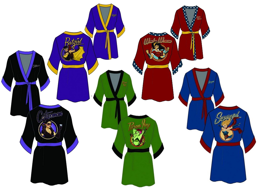 Ant Lucia's classic pin-up style artwork of DC Comics' super-heroines graces the DC Bombshells Satin Robes from Underboss! Available in Small/Medium and Large/X-Large for $48.00, the robes come in various colors reflecting the DC Comics character featured on the back of each robe in addition to the characters name stitched on the front. Choose the robe you like best for yourself or for the bombshell in your life!