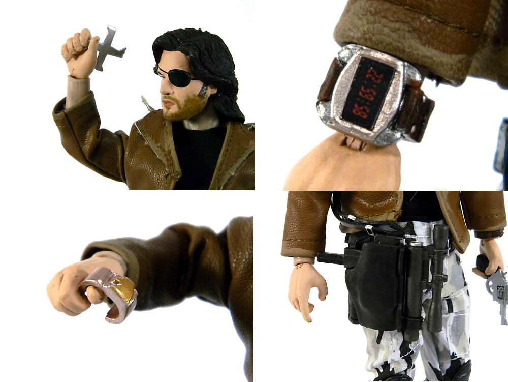 And the accessories keep coming! In addition to his killer-looking MAC-10 and revolver, Snake Plissken packs a throwing star, the wrist tracker used to find the President, and comes wearing his countdown timer (which can be removed): the clock ticking down from 22:59:58. To hold the throwing star, NECA even includes an alternate hand, just another small attention to detail that fans will appreciate.