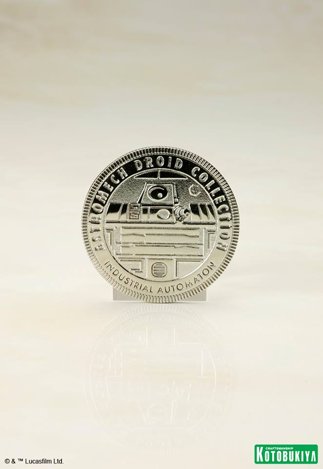 R3-A2 stands nearly 4 inches tall in 1/10th scale, includes alternate pieces allowing for display standing upright on two legs or inclined on all three, and comes with a special collector’s coin featuring the logo of Industrial Automation, the manufacturers of Astromech Droids. K-3PO stands over six inches tall, his white metal casing showing damage from a previous engagement. Both Droids feature magnets in their feet for extra stability on the included base, and assemble in seconds with the ARTFX+ line’s easy, snap-fit assembly.