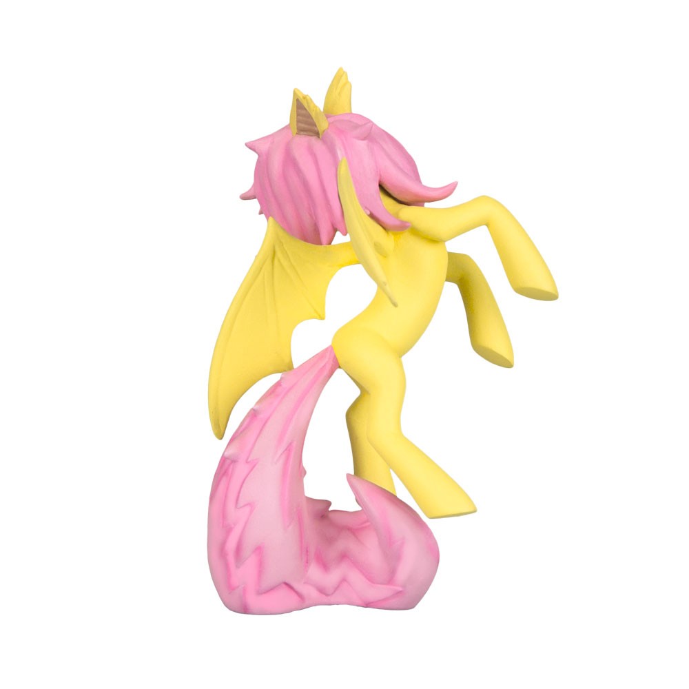 WeLoveFine's My Little Pony: Friendship Is Magic vinyl series is back with one of the biggest fan-favorite hits from the television show. In the Season 4 episode "Bats!" the Mane Six investigate an infestation of vampire fruit bats on Applejack's farm that have been sucking the juice out of all the apples. In the process of trying to get rid of them Fluttershy is infected, turning into a Vampire Fruit Bat/Pony creature called Flutterbat! With fangs, notched ears, bat wings, and bats on her cutie mark this fearsome menace was more of a threat than any flock of bats and it took the combined strengths of her friends to return Fluttershy to her normal self. WeLoveFine now captures the unique look and attitude of Flutterbat in their latest vinyl statue designed by emilySculpts! Approximately 5.25 inches tall, the "evil" Fluttershy leaps into the air balanced on her thick tail and looks over her shoulder at the prey below. The statue includes all of the Flutterbat details down to the fangs in her open mouth and pops in the character's traditional yellow and pink colors. Flutterbat is $28 and due out in August, and a limited number of preorders are still available that include a special Flutterbat/Fluttershy Collectible Coin by Akili-Amethyst!