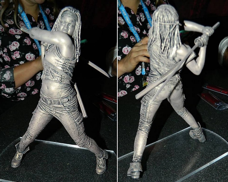 McFarlane's super-sized 10 inch figure series receives some sword-swinging action this October with the release of Michonne. We were at McFarlane's booth as they were unboxing the unpainted prototype (pictured above) and we have to say it looks phenomenal. Michonne follows fan-favorites Daryl Dixen and Rick Grimes in the 10" Walking Dead figure series.