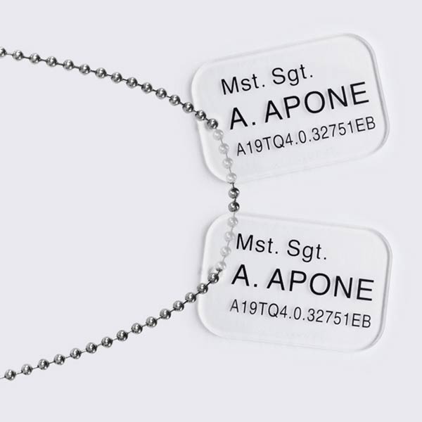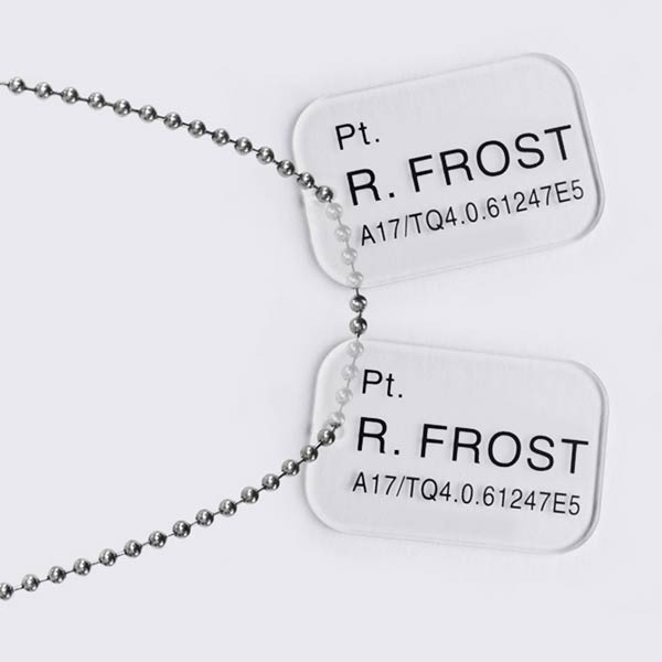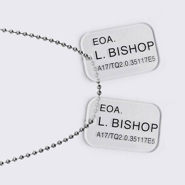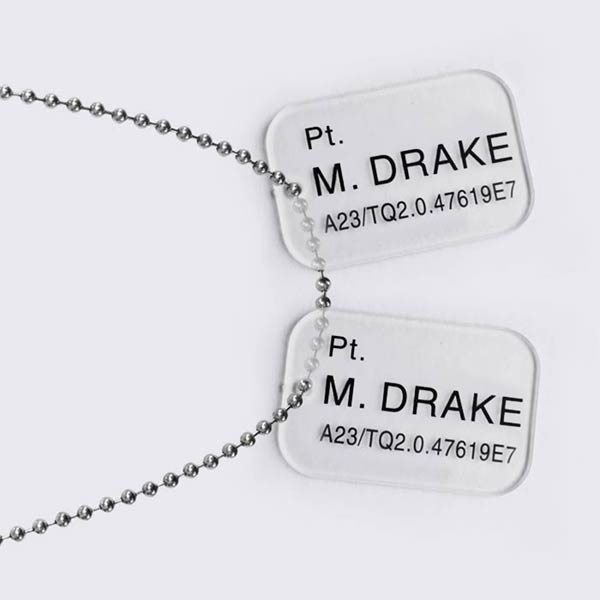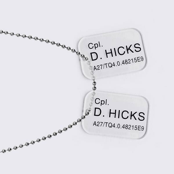 These authentic reproductions are made from clear acrylic, exactly the same as the ones used in the movie, and complete with name, rank and serial number. Each consists of two identical Dog Tags and a ball chain. The first wave set consists of Hicks, Drake, Bishop, Apone and Frost.
