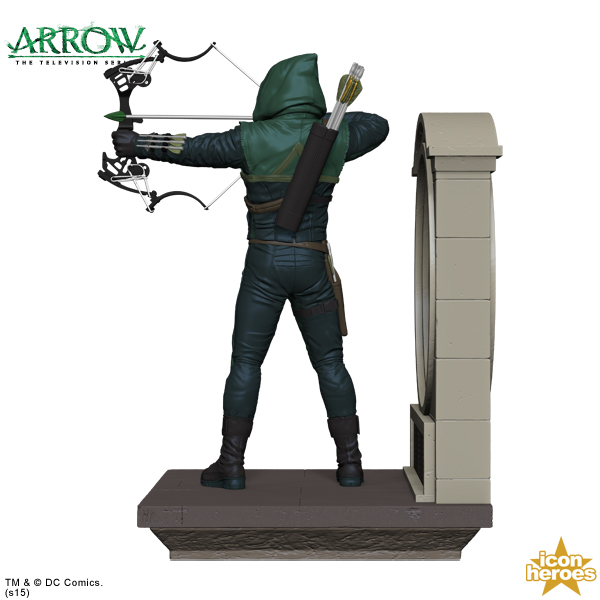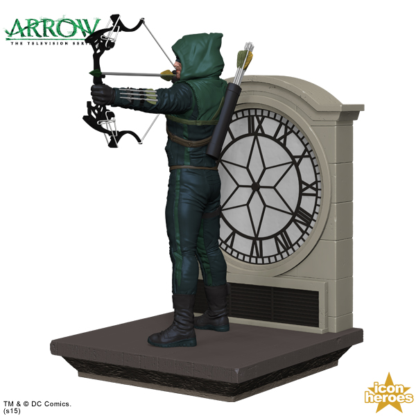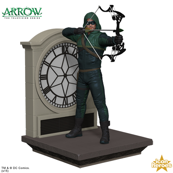 Icon Heroes continues their range of licensed DC Comics bookends with the addition of Arrow. Based on the hit CW television series, the Arrow bookend depicts the famed archer standing on a clock tower base, as seen in Season 2. This Arrow bookend stands approximately 9 inches tall and is made of high quality polystone, making a perfect display while holding up your favorite books, games, movies, and more.