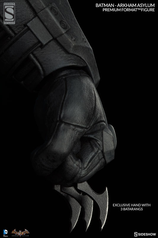 Sideshow presents the headline hero of their new Arkham collection, the Batman: Arkham Asylum Premium Format Figure. Poised for combat atop an Arkham Asylum themed base, Batman features an interchangeable swap-out hand clutching a Batarang and a free-flowing tailored cape. The Sideshow Exclusive edition includes an additional swap-out hand holding triple Batarangs (shown below).