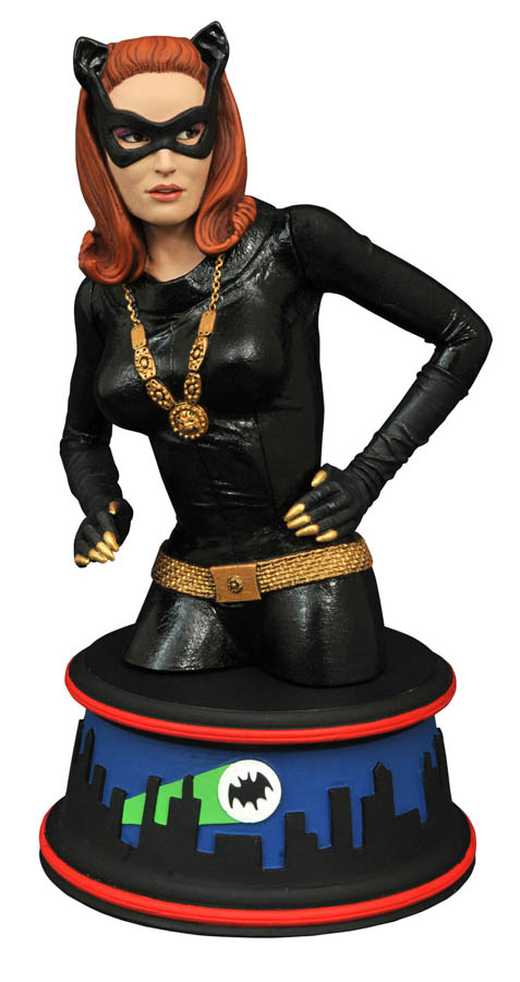 Batman's rogues gallery continues to grow as Catwoman joins the Riddler and the Joker in DST's line of busts, based on the Classic Batman TV Series! This 6-inch-tall resin bust depicts Julie Newmar as Catwoman, perched atop a colorful base inspired by the show's animated opening credits. Even with her mask on, Catwoman's hypnotizing beauty will have Batman baffled! Packaged in a full-color box with a certificate of authenticity. Designed by Barry Bradfield! Sculpted by Jean St. Jean! (Item #MAY152172, SRP: $59.99)