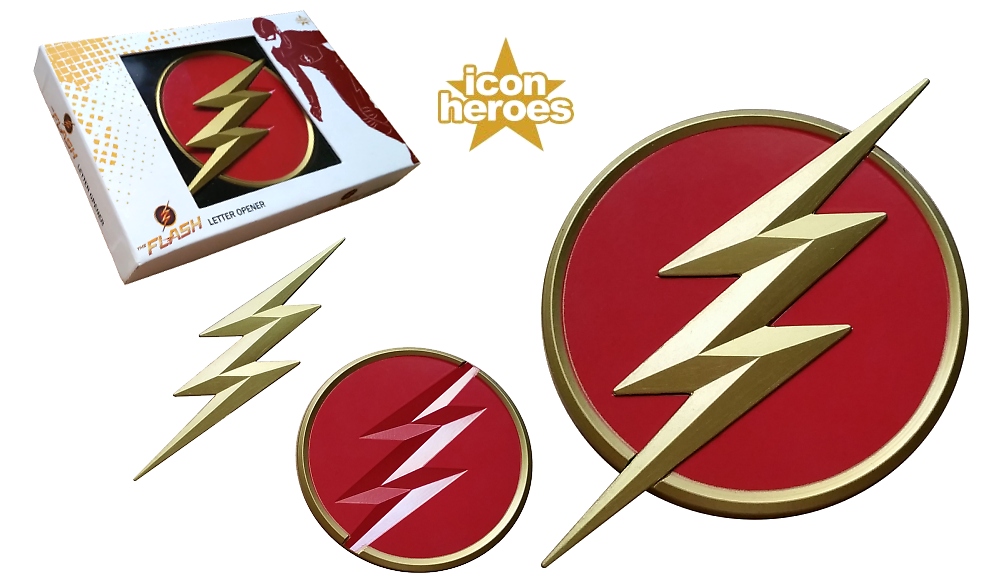 Icon Heroes reveals their San Diego Comic Con exclusive Flash TV Letter Opener. Measuring approximately 7 inches long, the lightning bolt letter opener is made of high quality metal and stores nicely on the scarlet circular base showing the Flash's iconic symbol. SRP $28.