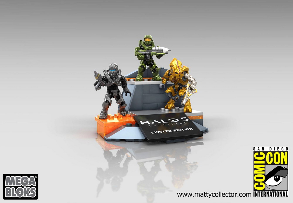 MEGA Bloks announces that they will be offering a Halo Icons Collector Pack at San Diego Comic-Con 2015. The set comes with three limited edition Halo 5 characters: Spartan Locke, Master Chief, and the Arbiter. These iconic figures are equipped with detailed, game accurate weapons, a unique metallic finish, and detailed battle armor to re-create pivotal events in the Halo universe. Also included is a buildable display stand and Halo 5: Guardians name plate.